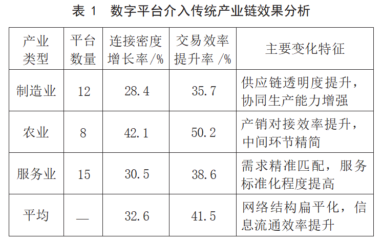 传统产业链结构呈线性特征,产业链上下游企业通过固定供应关系形成稳定连接。数字平台构建开放生态系统,打破传统产业链封闭边界[5]。数据分析显示数字平台介入后,产业链网络连接密度平均提升32.6%,交易效率提升41.5%。数字平台介入传统产业链的效果汇总如表1所示。