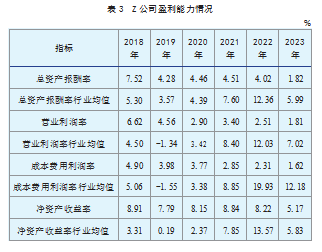 在对Z公司绿色创新现状分析的基础上,本文对Z公司2018—2023年财务数据进行计算和整理,基于盈利能力、偿债能力、营运能力和发展能力等角度分析绿色创新对Z公司财务绩效的影响,并构建综合财务绩效评价指标体系,系统评估其协同效应。