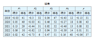 经KMO抽样适当性检验(0.701)与Bartlett球形检验(p<0.001)验证数据适用性后,采用主成分分析法提取特征根>1的4个公因子,分别用F 1、F2、F3和F4表示。F1在总资产报酬率、营业利润率、成本费用利润率和净资产收益率4项指标上呈现高载荷,对应方差贡献率28.171%,命名为“盈利能力因子”;F2的载荷主要集中在流动比率、速动比率、利息保障倍数资产负债率上,方差贡献率为14.49%,命名为“偿债能力因子”;F3的载荷主要集中在存货周转率、固定资产周转率、总资产周转率和应收账款周转率上,对应方差贡献率13.57%,命名为“营运能力因子”;F4的载荷主要集中总资产增长率、固定资产增长率和营业收入增长率上,方差贡献率为7.22%,命名为“发展能力因子”。根据各因子对应的方差贡献占累计方差贡献率63.451%的比重,构建综合财务绩效评价模型:F=0.404 9×F 1+0.261 5×F2+0.212 2×F3+0.121 4×F4。