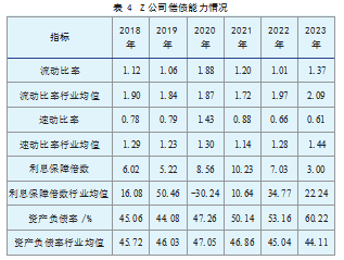 如表4所示,Z公司的偿债能力与行业均值相比呈现出一定的波动。流动比率方面,Z公司的流动比率在2018—2023年间呈波动上升趋势,虽整体低于行业均值,但增幅达到22.32%。这表明Z公司的短期偿债能力相对较弱,可能绿色创新活动在短期内占用了部分流动资金,但结合应收账款周转率指标分析,Z公司资金周转速度和资产流动性仍优于行业平均水平。速动比率方面,2018—2019年Z公司速动比率年均约为0.785,2020年后流动性保障水平显著强化,年均比例升至0.895,增幅为14.4%,虽仍与行业均值存在差异,但已有改善。利息保障倍数指标在2018—2019年平均水平维持在5.62,2020年后实现35.43%的增幅跃升至7.205,说明绿色创新使得Z公司长期偿债能力有所改善。资产负债率方面则呈现持续上升态势,整体略高于行业均值,体现出公司在战略扩张周期中资本结构的阶段性调整特征。然而,考虑到绿色创新可能带来的长期效益,Z公司在绿色转型过程中的投入,可能会在未来逐步转化为偿债能力的提升。综合来看,Z公司2020—2023年偿债能力指标较2018—2019年实现显著提升,验证了绿色创新战略的持续深化对Z公司资本结构韧性的提升效应。