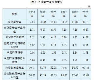 由表5可知,2018—2023年Z公司存货周转率、固定资产周转率、总资产周转率、应收账款周转率均呈现波动上升趋势,上升幅度分别达29.12%、30.48%、66.35%和217.10%。这说明企业持续导入绿色创新与绿色工艺,不仅提升了运营效率,更在市场竞争维度赋予产品差异化竞争优势,同时促进供应链响应速度与资产周转速率的系统性优化。尽管存货周转率在2023年有所回落,但仍高于行业均值,说明整体上Z公司的存货周转速度较快,有助于减少库存积压。Z公司固定资产周转率低于行业平均水平,说明企业在固定资产管理和使用效率仍有提升空间,但整体维持在合理区间。总资产周转率和应收账款周转率则持续呈现上升趋势,近三年提升尤为显著,且多数年份高于行业均值。这可能是因为绿色创新的周期特性导致创新效应滞后,使得2018—2020年度绿色创新投入对资本周转效率的提升效应在2021—2023年间逐步释放,进而驱动企业运营效率持续优化。综上所述,Z公司营运能力呈现稳步提升态势。
