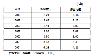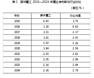 (2)营业净利率。振华重工2015—2024年营业净利率变动见表2。从表2看出,振华重工营业净利率常年低于行业均值,其原因主要是原油价格暴跌导致的海工订单毁约,使得公司利息费用增加。但是随着数字化进程深化,公司通过智能供应链平台协同全球供应商与生产基地,整合采购、生产、物流全流程资源,优化企业成本结构,营业净利率由2015年0.83%提升到2024年的2.26%,与行业均值的差距逐渐缩小。由此可见,通过数字化重构成本管控体系,振华重工盈利能力实现系统性改善。