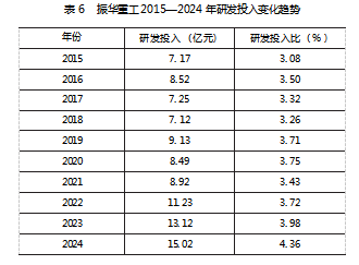 (1)研发投入比。振华重工2015—2024年研发投入变化趋势见表6。从表6看出,振华重工研发投入金额与研发投入比重在2015—2024年出现显著的上升趋势,2019年之前研发强度(研发投入占营业收入的比例)在3.3%左右,在2019年步入企业数字化成熟阶段后,研发强度实现突破达到3.71%,2024年增长至4.36%。虽然2021年新冠疫情冲击导致营业收入阶段性承压,但研发投入比仍稳定在至3.43%的高位,凸显了振华重工的创新战略定力。振华重工对于研发创新的投入,为企业在高端装备制造领域的持续竞争力提供了核心技术保障。