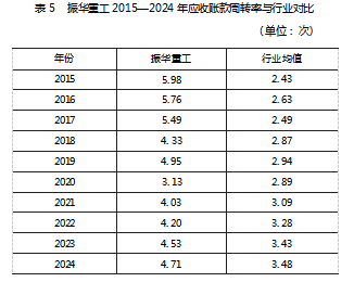 (3)应收账款周转率。振华重工2015—2024年应收账款周转率变动见表5。从表5看出,振华重工的应收账款周转率虽呈现阶段性调整,但始终显著高于行业均值。分阶段观察可见,在2015—2018年受大型装备占比提升与全球项目结算周期延长影响,周转率从5.98次阶梯式下滑至4.33次;2019年进入数字化成熟阶段后,尽管2020年受疫情影响和海外主权项目增加导致周转率阶段性下降,但随着数字化信用管理平台的深度应用,在2021年后周转率连续3年稳步回升,这标志着振华重工通过数字化重构信用管理体系有效提升了回款效率。