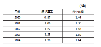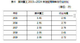 (2)存货周转率。振华重工2015—2024年存货周转率见表4。从表4看出,存货周转率在2015—2020年间出现波动下滑,其主要原因是企业为夺取全球超大型港口机械市场主导权,主动增加高价值定制化设备生产,导致单台设备生产周期延长,叠加2020年疫情存货滞港冲击,周转率于2020年跌至0.87次。在2020年后,企业通过智能排产系统压缩在产品周期,数字孪生技术降低备件库存,驱动存货周转率连续3年逆势提升至1.26次,较谷底改善43.7%。尽管2024年数值仍低于行业均值,但差距逐渐缩小,未来趋势逐渐向好。