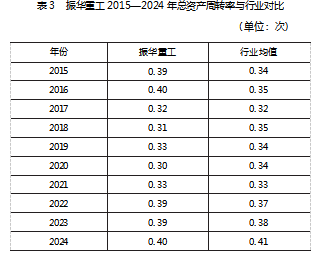 (1)总资产周转率。振华重工2015—2024年总资产周转率见表3。从表3看出,总资产周转率在2016—2020年间出现波动下滑,这与数字化转型初期大规模固定资产投入导致资产规模短期内显著增加而产出效益释放存在一定滞后性有关。值得注意的是,2021年后总资产周转率开始企稳回升,主要原因是数字化体系成熟后对资产运营效率的积极拉动作用逐步显现。