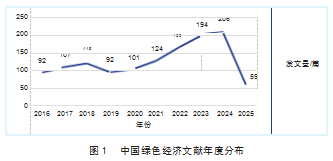 图1显示了2016—2025年,中国绿色经济研究文献的年度分布情况。其中,2016年的发文量仅92篇,之后发文数量逐年上升,研究开始进入系统化阶段,2018年发文数量达到峰值119篇。2019年有所下降,但2020年之后伴随着“双碳”目标的提出,绿色经济研究领域发文量开始呈现迅速增长态势,2024年达到新的峰值206篇,说明近年来的研究热度较高。