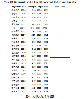 此阶段绿色经济研究热度持续高涨,处于繁荣发展阶段。其中,“绿色创新”(2019—2023年,强度4.25)、“空间溢出”(2022—2023年,强度3.57)、“数字金融”(2022—2023年,强度2.49)、“数字经济”(2021—2025年,强度20.9)、“耦合协调”(2023—2025年,强度4.42)、“碳减排”(2023—2025年,强度1.36)等关键词突现。这一时期“数字经济”成为研究的超级热点,突现强度远超其他关键词,反映出数字技术对绿色经济的全方位渗透与深度融合,研究聚焦于数字经济如何赋能绿色产业、绿色金融、绿色创新等方面,推动绿色经济的数字化转型与高质量发展;此外,“绿色创新”持续受到关注,强调创新在绿色经济持续发展中的关键作用,研究方向涉及技术创新、商业模式创新等多方面;“空间溢出”“数字金融”等关键词体现了研究对绿色经济空间关联性与金融支持体系的新视角探索;该阶段研究进入数字化转型与多维度聚焦的新时期,数字化、创新、协调、减排等成为核心主题,研究内容更加精细化、深入化,且跨学科研究特征愈发明显,为解决绿色经济发展中的复杂问题提供了更全面、系统的思路与方案。