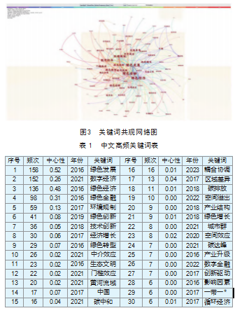 结合图3和表1可知,“绿色经济”位于中心区域是研究的核心主题,与众多关键词存在共现关系。经济领域:绿色经济与数字经济(频次152)、经济增长(频次30)以及门槛效应(频次22)等紧密相连,表明研究者们重点关注绿色经济对经济增长模式转变、产业结构调整的影响及在不同经济条件下的作用机制;生态与环境领域:绿色经济与绿色发展(频次158)、绿色创新(频次41)、绿色金融(频次98)以及碳达峰(频次7)、碳中和(频次16)等高频共现,这表明现有研究还重点关注绿色经济在生态环境保护、资源可持续利用及绿色技术、产业和金融体系构建方面的作用,而其与绿色金融的强关联性,说明绿色金融为绿色项目提供资金支持,需完善绿色金融体系、创新工具助力绿色经济高质量发展;社会与政策领域:绿色经济与耦合协调(频次16)和城市群(频次8)等存在关联,强调多元主体参与、政策保障与国家宏观战略的契合。同时,绿色经济与技术创新(频次36)共现频次高,表明创新是其发展的核心动力,新能源、环保工艺等创新推动能源转型与污染控制。此外,绿色经济与区域差异(频次13)也联系紧密,体现出不同区域因资源、产业基础差异而存在不同发展模式,需因地制宜推进。整体来看,绿色经济研究呈现跨学科交叉融合特征,未来将进一步聚焦领域协同推进、技术创新驱动的发展模式及应对全球挑战的可持续发展战略构建。