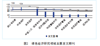 图2显示了2016—2025年在绿色经济研究领域发文量排名前十的中文核心期刊。其中,《统计与决策》排名第一,共发文108篇;《环境保护》排名第二,发文量104篇;《生态经济》排名第三,发文量79篇。此外,《中国人口·资源与环境》(73篇)、《经济问题探索》(55篇)、《科技管理研究》(53篇)也是中国绿色经济领域发文数量较多的中文核心期刊,该分布特征揭示了绿色经济研究在统计决策、生态环境保护以及科技管理创新领域的重要作用。