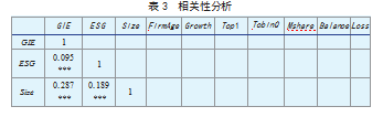 表3展示了各变量之间的关系。结果显示,ESG与绿色投资效率的相关系数在1%的水平上显著为正,初步证明ESG表现可能会提高企业的绿色投资效率,与预期假设一致。多重共线性检验各值均小于10,说明变量间不存在多重共线性。