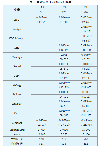 分析师作为企业与资本市场之间信息交互的关键枢纽,其角色不仅局限于信息的有效传递,更承担着对企业运营状况进行监督的重要职责。在当下,随着社会各界对于企业环境责任与社会责任的关注度的不断提高,分析师的关注视角及分析结论在企业治理过程中发挥监督制衡作用,进而弱化风险资本对企业短视化价值取向的引导影响。当企业面临来自外部环境的高强度压力时,企业管理层在权衡风险资本退出企业的同时,也需充分考量分析师基于专业视角进行的风险评价,以及社会舆论聚焦所产生的监督效应,以保障企业战略决策的科学性与可持续性,从而促使企业更重视ESG表现的长期改善,以防企业的声誉因此受损。根据信息不对称理论,分析师通过深度研究企业ESG数据,挖掘非财务信息,向市场传递更全面的信息,降低投资者的信息不对称程度,从而帮助投资者更好地识别具有价值的投资项目。ESG表现良好的企业在分析师关注下,能够吸引更多的资本流入,加速绿色项目的融资和扩张。综上,分析师关注通过信息整合、监督压力和资本引导来强化ESG表现对绿色投资效率的正向影响。因此,提出调节效应假设2:分析师关注正向调节ESG表现与绿色投资效率的关系。即企业的分析师关注度越高,ESG表现对绿色投资效率的提升作用越强。