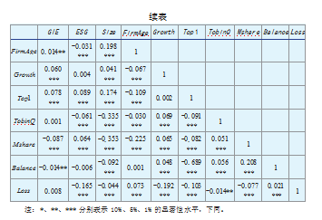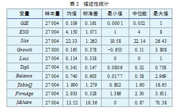 各变量的描述性统计如表2所示,从绿色投资效率的最大值和最小值来看,样本企业之间的绿色投资效率差距较大,说明部分企业的绿色投入规模有待提高,投资效率低下。ESG表现的均值为4.150,说明大部分样本企业积极践行ESG实践。但最大值和最小值差距较大,说明仍有部分企业的ESG表现有待提高。
