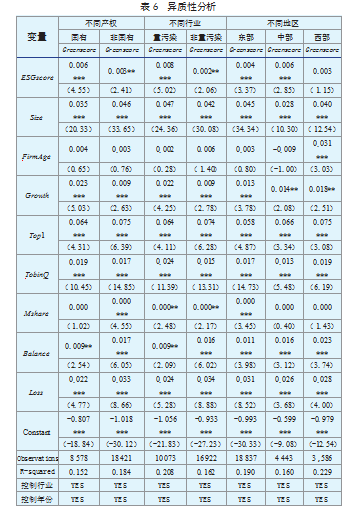 为了探究企业ESG表现对绿色投资效率的影响的地区异质性,将样本企业划分为东中西部3个地区子样本,并进行分样本回归。结果如表6所示,东部与中部地区的回归系数均显著,但中部地区的回归系数最大。西部地区的企业ESG表现的回归系数不显著。说明东部以及中部地区的企业ESG表现对绿色投资效率的影响更显著。