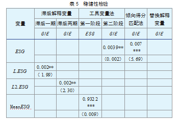 为缓解内生性问题,参考王琳璘等[11]的研究,对解释变量ESG表现采用滞后一期、两期进行稳健性检验。结果如表5所示,ESG表现的回归系数在5%的水平上依然显著为正,与上文结果一致。