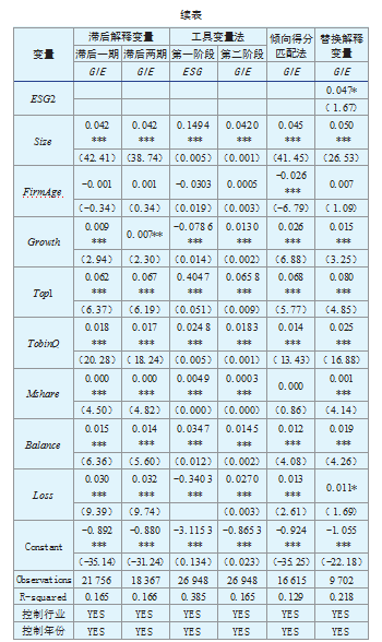 为了避免样本自选择偏差引起的内生性,选取PSM(倾向得分匹配)方法进行匹配,并选择最近邻匹配(1∶1)。首先根据ESG表现的均值分为高ESG评分组和低ESG评分组,将高ESG评分组赋值为1,低ESG评分组赋值为0,然后使用上文的8个控制变量作为匹配变量,最后根据回归结果,ESG的回归系数在1%的水平上依然显著为正,假设1仍然成立。