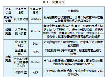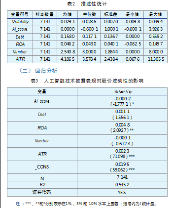 在模型设定中,i表示企业个体,t表示时间维度,Volatility代表股价波动性,AI_score代表人工智能技术披露程度,其他变量如偿债能力(Debt)、营业能力(ROA)、持有本公司股份的董事总人数(Number)、年换手率(ATR)等均作为控制变量,αi为企业个体固定效应,∈it为服从独立同分布的随机误差项。