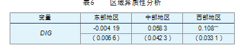 为了考察数字经济对城乡收入差距影响的区域异质性,将全国样本分为东部、西部、中部地区,结果如表6所示。从回归结果来看,只有西部地区通过了1%显著性检验,中部地区和东部地区的结果并不显著。可能原因在于东部和中部地区的城乡居民收入差距受到多重因素影响,数字经济对城乡居民收入差距的影响还未充分显现。