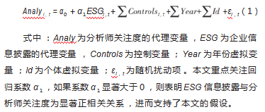 为了检验ESG信息披露对分析师关注的影响,本文借鉴黎来芳等[28]的研究,构建如下回归模型。