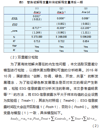 此外,本文还选取被分析师关注(Analy1)作为被解释变量的代理变量,其计算方式为对企业进行跟踪分析的分析师人数加1取对数。回归结果如表5列(2)所示,ESG信息披露系数在1%的水平上显著为正。综合以上分析,我们可以清楚地看到ESG信息披露与分析师关注之间存在显著的正相关关系,这进一步验证了研究初期提出的假设1。