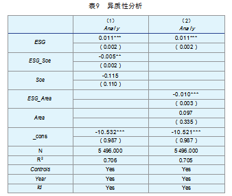 企业的产权性质不同,会影响企业对ESG理念的践行程度,进一步导致ESG信息披露在不同产权性质的企业中对分析师关注的影响不同。本文按照企业的产权性质划分,引入虚拟变量Soe,将国企设置为1(Soe=1),其他设置为0(Soe=0)。结果如表9列(1)所示,交互项ESG_Soe的系数在5%的水平上显著为负(估计系数=-0.005,t值=0.002),这说明相比于非国企,国企削弱了ESG信息披露对分析师关注的促进作用。具体原因为:国企容易获得政府各项支持,所以对于国企而言,ESG信息披露可能更多地被视为一种合规行为,并不是基于市场竞争或是融资需求的自发行为[34]。而非国企面临着上市、融资等多种压力,需要通过ESG信息披露获得更多分析师关注,进而吸引投资者、提升市场声誉。