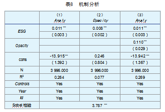 根据上文的分析可以得知,ESG信息披露可以通过降低分析师信息获取成本[27]来提高分析师关注。据此,本文构建了ESG信息披露—信息获取成本—分析师关注的传导机制,借鉴温忠麟等[32]的方法对此进行中介机制检验。本文参考王瑶等[33]的方法,选择国泰安数据库的上市公司透明度(Opacity)作为信息获取成本的代理变量,并将D—A等级分别赋值1—4分。上市公司透明度等级越高,分析师可获取的信息就越多,获取信息所需时间、精力等成本也越低。表8为中介机制的检验结果。由表8列(3)可知,Opacity的估计系数在1%的水平上显著为正,其中Opacity的估计系数为0.110,t值为0.029。其次,Sobel检验的P值也在1%的水平上显著,这说明存在中介效应。此外,由列(2)可知,ESG信息披露的估计系数在1%的水平上显著为正(估计系数=0.008,t值=0.002),这说明信息获取成本发挥部分中介效应,假设2得到了验证。