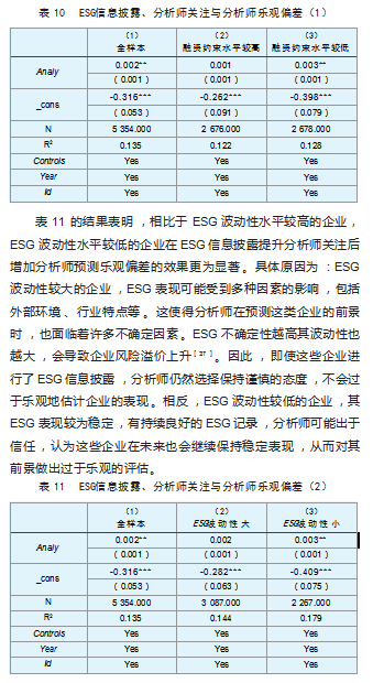 本文还探讨了ESG信息披露提升分析师关注后带来的经济后果。结果表明,ESG信息披露提升分析师关注后,还会进一步增加低融资约束水平和低ESG波动水平企业的分析师预测乐观偏差。具体结果如表10和表11所示。