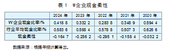 2021年到2022年W企业现金比率持续下降。以2021年为例,2021年在排除该因素影响后,现金比率降低到34.89%,对比行业均值要低15.84%,这意味着W企业2021年现金柔性为-15.84%。根据W企业年报,2021年W企业货币资金同比下降了11.49%,交易性金融资产同比下降79.18%,而流动负债同比增加了21.02%。根据W企业纰漏的年报分析可知,W企业现金比率下降不仅仅是排除结构性存款投资重分类因素后的结果,其影响因素是多方面的,一方面,受不确定性因素影响,企业生产经营成本增加,导致W企业现金持有量降低;另一方面,W企业致力于创新研发,推出一系列创新产品,应用多项创新技术,在核心性能上持续突破,加大了研发投入,其研发费用支出同比上升18.74%;同时,W企业还不断拓展销售渠道,线上线下市场进一步融合,提升服务质量,强化海外本地化运营,这些战略的推进都投入了大量资金。以上诸多因素共同作用,使得W企业现金比率降低。2023年到2024年W企业现金比率持续上涨,根据年报分析,是因为不确定性因素结束后,企业生产经营成本下降,营业收入增加。同时,W企业前期对于核心技术的持续投入研究,在主赛道及新产业技术方向上均取得重大突破,为W企业创造了巨大的收益,但是由于W企业始终坚持对核心技术的持续投入研究,以及持续深化拓展渠道,其资金依旧大量投入到创新研发与拓展市场中,因此W企业现金比率依旧低于行业均值,但这并不意味着W企业现金柔性不足,难以实现可持续发展。企业的现金比率达到20%以上,就意味着企业的现金持有量良好,W企业已经达到了这个边界值,W企业现金比率低于行业水平是因为其将大量资金用于创新研发与拓展市场方面,总体来说W企业的现金柔性处于良好状态。
