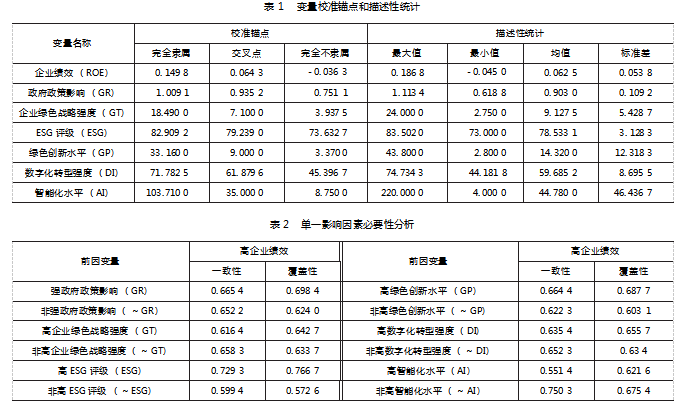 模糊集定性比较分析法(fsQCA)旨在通过案例间的比较,找出条件组态与结果间的因果关系,回答“条件的哪些组态可以导致期望的结果出现?哪些组态导致结果的不出现?”这类问题。该方法可以通过组态效应来解释因果之间复杂关系,探索出特定结果存在的多种等效路径[18]。在揭示条件变量的不同组合可能引致相同结果的同时,强调相同条件变量在不同研究情境下可能对结果产生的差异化影响,能够帮助研究者找到导致某一结果的最佳路径[19]。研究使用fsQCA方法来检验绿色转型背景下政府政策、企业绿色战略、绿色创新水平、ESG评级、数字化强度、智能化强度6个解释因素如何相互作用而共同影响企业绩效。