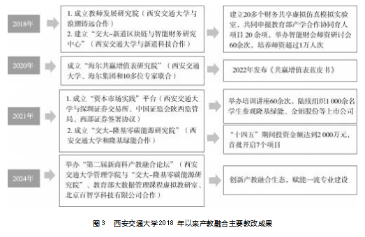 西安交通大学会计学院在产教融合方面积极与企业建立合作关系,组建师资队伍,共建科研发展平台,引入智能化的财务软件,采用虚拟仿真技术使“业+财+资+税”一体化系统得以展现。在专业课程教学编写方面,会计学院教师积极与实践经验丰富的行业专家合作,实现跨领域融合,以增强教材内容的前沿性和实践价值[7]。西安交通大学2018年以来在产教融合教学改革方面的主要成果见图3。