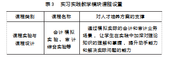 实践教学模块主要强化学生的实践能力和职业素养,使学生能够将所学的理论知识与实际工作相结合,具备独立开展审计工作的能力,适应审计行业的实际需求,培养具有创新精神和实践能力的应用型审计人才。具体课程设置见表3。