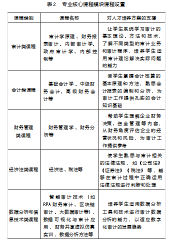 专业核心课程模块主要让学生掌握审计学专业的核心理论知识和专业技能,具备扎实的专业基础和较强的实践能力,能够运用所学知识解决实际审计问题,培养学生的专业素养和职业胜任能力。具体课程设置见表2。
