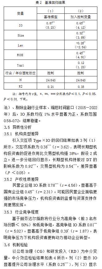 [摘要]在数字经济快速发展与“十四五”数字经济规划深入实施的背景下,数字化转型已成为企业提升核心竞争力的关键路径。本文基于2010—2022年A股上市公司数据,实证检验机构投资者持股对企业数字化转型的影响效应与作用机制。研究发现,机构投资者持股比例每提高1%,企业数字化转型水平显著提升0.87%,且长期型机构投资者的促进作用较交易型机构强32%;机制检验表明,机构投资者通过改善公司治理和增加研发投入双重路径推动数字化转型;异质性分析显示,上述效应在民营企业和高竞争行业中更为显著。本研究为优化机构投资者结构、完善企业数字化转型政策提供了参考,建议通过培育长期资本、强化信息披露等方式引导机构投资者发挥积极治理作用。