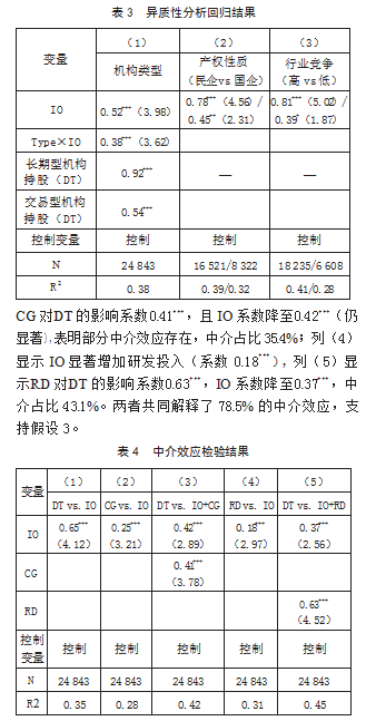 第三,机构投资者通过改善公司治理(降低代理成本)和增加研发投入双重路径推动数字化转型,中介效应占比分别为35.4%和43.1%。