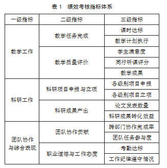 为保证高职院校部门绩效管理的科学性与有效性,本研究构建了一套健全的绩效考核指标体系,其紧密围绕高职院校的教学、科研、团队协作等核心职能,从多个维度进行设计,以全面评估教职工绩效[3]。绩效考核指标体系如表1所示。