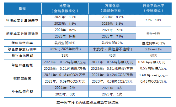 万华化学实施局部数字化措施,取得的成效有限,主要表现为计量误差率下降26%,分摊准确率提升22%;能耗与排放下降不足10%,2023年仍有年度环保处罚记录。由此可见,数字技术在环境成本核算中的应用深度与核算效能呈正相关,全链条数字化模式可以更好地满足企业环境成本核算的绿色金融需求,为绿色资源精准配置提供实践支撑。