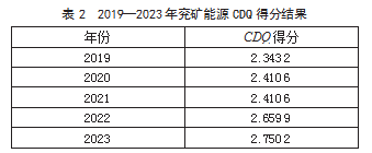 整理兖矿能源2019—2023年的年报及环境、社会和公司治理(Environmental,Social and Governance;ESG)报告等,对CDQ进行打分(结果保留小数点后四位,见表2)。