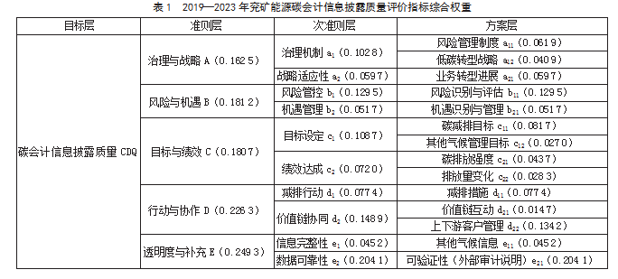 [摘要]在全球气候治理稳步推进与我国“双碳”目标加速落地的背景下,企业碳会计信息披露已成为衡量其环境责任履行与低碳转型成效的重要标尺。作为高碳排放行业的典型代表,煤炭企业的碳会计信息透明度不仅关系到利益相关方的决策有效性,还深刻影响着“双碳”目标的实现进程。文章以煤炭行业代表性企业——兖矿能源集团股份有限公司(以下简称兖矿能源)为研究对象,结合层次分析法(Analytic Hierarchy Process,AHP)与熵权法构建多维碳会计信息披露质量评价体系,系统评估其2019—2023年碳会计信息披露质量,剖析现存问题及成因,并从国家、社会、企业层面提出解决方案,以期为同类企业提升碳会计信息披露质量提供参考,助力高排放行业绿色转型与“双碳”目标实现。