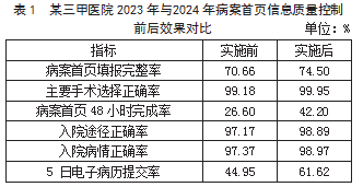 某三甲医院实施病案首页信息质量控制后,各个信息指标都发生了变化,给病案信息管理带来了切实影响。该医院病案首页填报完整率由70.66%升至74.50%,意味着病案信息完整度提高,为日后的信息统计和利用提供了便利;主要手术选择正确率从99.18%升至99.95%,进一步确保了手术信息的准确性,为医疗质量评价等工作夯实了基础;病案首页48小时完成率由26.60%显著升至42.20%,明显加快了病案处理的速度,使病案可及时服务于医保结算、临床教学等方面;入院途径正确率、入院病情正确率分别有所提升,保证了患者基础信息和病情记录的准确性;5日电子病历提交率由44.95%提升至61.62%,有利于信息分享和长期管理,具体如表1所示。综合来看,病案首页信息质量控制有效提高了病案信息的完整性、准确性、及时性,提升了病案信息的管理效率,也让病案作为医疗信息关键载体的价值得到更充分的体现。