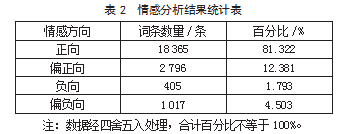 本研究利用SPSSAU软件进行文本情感分析,基于语义情感词典对评论文本自动赋分,情感得分介于[-1,1],得分>1/3为正向情感,0<得分≤1/3为偏正向情感,-1/3≤得分<0为偏负向情感,得分<-1/3为负向情感。情感分析结果(见表2)显示,游客评价整体呈现正向倾向。正向评价占81.322%(18 365条),偏正向评价占12.381%(2 796条),二者合计93.703%;负向评价占比少,直接负向评价占1.793%(405条),偏负向评价占4.503%(1 017条),合计6.296%。这表明海南免税店获得了游客的广泛认可,正向情感占主导。