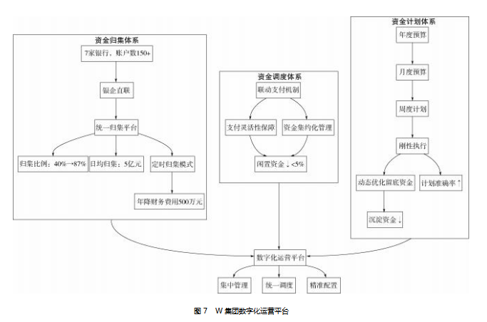 第三,资金调度与计划精准度提高。W集团系统创新性地采用联动支付机制,既保证了成员单位支付的灵活性,又实现了资金的集约化管理,闲置资金比例下降至5%以下;在资金计划管理方面,通过三级联动的预算管控体系配合系统刚性执行机制,以及资金计划模块对各账户留底资金进行动态优化,有效提高资金使用计划准确率,避免了资金闲置和临时拆借的情况。通过数字化手段,W集团构建了“集中管理、统一调度、精准配置”的数字化运营平台(见图7),实现了从分散低效向集约高效的根本转变。
