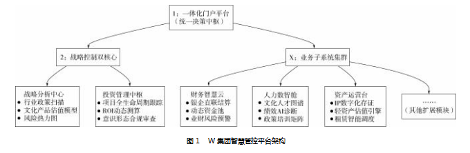 W集团资金管理数智化转型契机和动因可以分为外部推动和内部需求两方面。外部政策驱动方面,2022年国务院国资委发布《关于推动中央企业加快司库体系建设进一步加强资金管理的意见》的通知,要求将银行账户管理、资金集中等重点业务纳入司库体系,实现资金“看得见、管得住、调得动、用得好”。同时,该省出台国企数字化转型方案,明确要求省属企业上线资金集中管理系统,形成“中央部署—地方细化”的政策体系,推动资金管理从“分散粗放”向“精益智能”转型。内部管理需求方面,W集团数字化建设滞后,难以匹配现代化管理要求。为此,集团成立数字化工作专班,推出“1+2+X”智慧管控平台架构(见图1):“1”指一体化门户平台;“2”涵盖战略分析与投资管理;“X”覆盖财务、人力等子系统。资金管理作为财务管控核心,被纳入首期建设任务,以数字化手段提升管理效能。