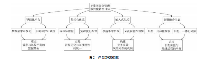 在明确内外驱动力的基础上,W集团进一步锚定了构建“可控的敏捷性”资金管理体系的转型目标。基于资源基础观、动态能力理论与制度理论的整合框架,王化成等[14]认为,将资金管理数智化转型定位为系统性能力建设,而非单纯的技术工具升级,W集团采纳了这一理念。转型目标紧密围绕“运营效率”与“合规风控”的动态平衡展开,旨在破解国有文化企业特有的“轻资产运营需敏捷”与“国资监管需稳健”之间的结构性矛盾,从而提高赋能企业高质量发展。