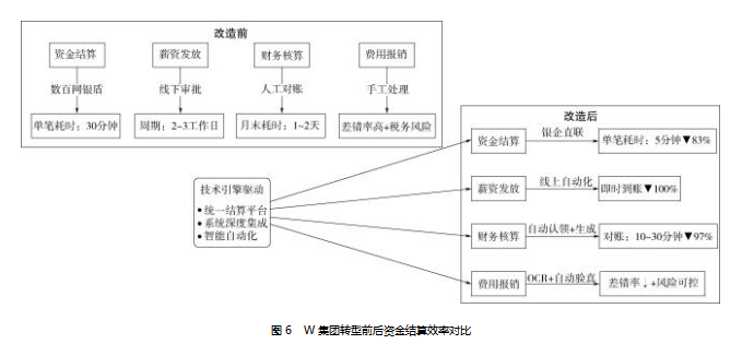 统一结算平台的建立使单笔结算时间从30分钟降至5分钟,薪资发放到账时间从2~3天缩短为即时到账。财务核算方面,通过系统对接实现银行流水自动认领、凭证自动生成,月末对账时间由1~2天缩短至10~30分钟。OCR识别和发票自动验真技术的应用,在提升报销效率的同时降低了税务风险。这些效率提升并非以牺牲风控为代价,而是通过技术手段将合规要求内嵌于业务流程中,实现了“高效率下的安全运营”。W集团数智化转型前后资金结算效率对比情况见图6。