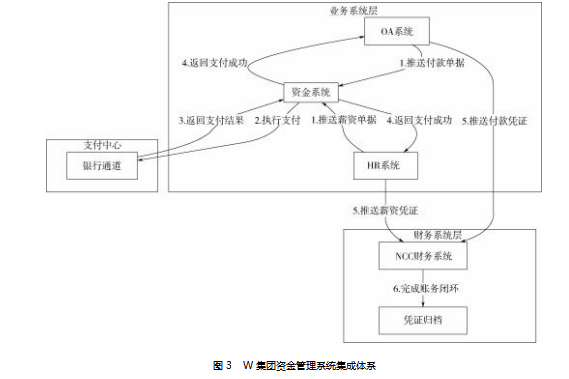 W集团通过系统整合与流程重构,推动业财深度融合,构建协同高效的数字生态体系:第一,统一报销体系与智能识别。上线标准化OA与人力资源系统,建立13类统一报销单据。在关键字段强制统一的基础上,允许下属单位保留个性化表单,兼顾规范与灵活。系统集成OCR识别与税务验真功能,自动提取发票信息并防范财税风险。第二,系统深度集成与流程自动化。构建费用报销、人力薪资、资金管理、财务核算一体化链路。通过系统接口实现数据联动,如报销表单自动推送至财务系统生成凭证,工资发放与资金支付无缝对接。第三,自动化对账与风控内嵌。资金系统依据预设规则,对利息收支等自动业务生成凭证,并支持银行流水智能对账与余额调节表自动生成。大额支付增设集团审批环节,强化风险管控。该机制通过技术打通与制度协同,实现了业务流、资金流、信息流的三流合一,显著提升效率与风控水平。系统集成结构见图3。