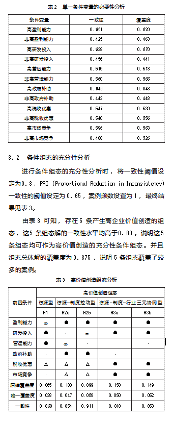 首先检验6个条件变量是否可以对企业价值创造这一结果变量的必要条件,当一致性结果超过0.9时,相应的前因条件被认为是结果所必需的条件。其6个条件变量均不是结果变量的必要条件,见表2。