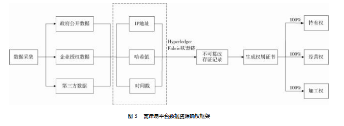 在数据资产确权方面,广电运通在法律和技术层面共同发力,构建了一套清晰、合规且可操作的数据资源确权框架,充分贯彻落实了数据二十条所提出的“三权分置”原则(见图3)。在法律层面,“离岸易”平台构建了精细化的多源数据授权矩阵,针对政府公开数据、企业授权数据及第三方采购数据等不同来源,分别设计了差异化的法律协议,明确约定了各参与方的数据持有权、加工使用权与数据产品经营权之间的法律边界、行使范围和收益分配机制。在跨境贸易场景下,广电运通严格遵循了《数据安全法》《个人信息保护法》及欧盟GDPR等国内外法律法规的合规性要求,确保了数据来源与流转过程的合法性,从初始环节就奠定了权属清晰的契约基础;在技术层面,广电运通引入了区块链技术作为确权的核心基础设施,基于Hyperledger Fabric联盟链构建了全程可追溯的数据血缘管理系统。所有接入“离岸易”平台的数据在其采集、清洗、加工、融合及应用的每一个环节,其IP地址、哈希值、时间戳等关键元数据都会被实时、不可篡改地记录于分布式账本之上,生成唯一的数字存证标识。区块链技术使数据产品的整个生命周期变得透明和可审计,同时从技术层面固化了数据与权利之间的关联,为法律意义上的权属主张提供了强有力的技术佐证。最终,广电运通成功地对“离岸易”数据产品主张了100%的数据产品持有权、加工权和经营权,并获得了广州数据交易所颁发的产权登记凭证,从而在实践层面有效地解决了数据资产化面临的首要权属困境。