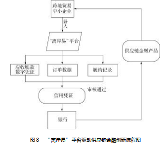 传统的金融业务十分依赖对企业资信的判断,而数据资产的引入,可以极大降低信息不对称性,提升金融服务的效率。“离岸易”平台自上线以来,对供应链金融的创新起到了重要推动作用,使传统的供应链金融效率得到充分的提升。由于平台提高了供应链的信息透明度,银行等金融机构能够更好地掌握上下游企业的经营数据和交易数据,进而原本缺乏授信的中小企业有更大的可能性获得融资(见图8)。在“离岸易”平台上,当一笔交易完成发货时,平台可以基于区块链生成一个应收账款的数字凭证记录,企业可持该凭证向银行融资或转让给第三方,实现即时的资金融通,而不必等待买方付款周期。同时,通过“离岸易”平台,银行可以看到企业稳定的订单数据和良好的履约记录,中小外贸企业因此获得了全新的“信用凭证”。银行基于“离岸易”平台的数据进行信用评估,审核通过后从而对企业提供应收款、预付款融资等供应链金融产品等,可以很大程度缓解中小企业融资难问题。目前,已有数十家南沙“离岸易”贸易白名单企业和多家银行通过平台实现对接,完成了融资保理等业务。