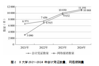 自2021年网络报销系统正式上线运行以来,D高校财务数字化转型进程显著加快,见图2。在会计制单方面,会计凭证数量从2021年的6 571份增至2024年的11 191份,体现出学院业务规模持续扩大、经济活动日益活跃,同时也反映出财务流程标准化、规范化水平的不断提升;在报销业务方面,从图2可以看出,数字化应用成效尤为突出。网络报销业务量从2021年的3 090份迅速攀升至2024年的10 868份,4年间增长率高达252%。这一显著增长不仅体现了报销业务流程数字化覆盖的快速推进,也反映出该系统在实际操作中的高效性和便捷性已获得教职工的广泛认同与采用。
