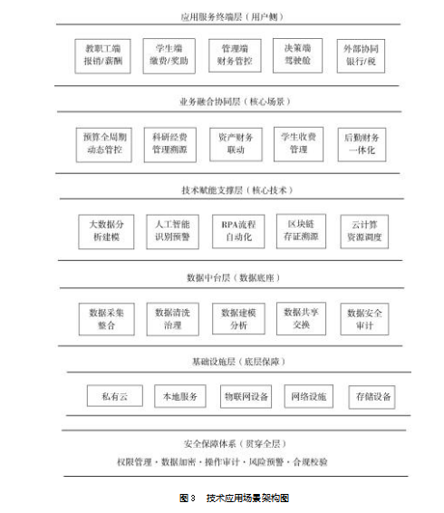 发展新质生产力要求将大数据、人工智能等新一代信息技术深度融入高校财务管理全过程,挖掘其在优化流程、提升效能、强化风控等方面的应用潜力,实现科技驱动下的财务管理转型升级,具体技术场景应用架构见图3。